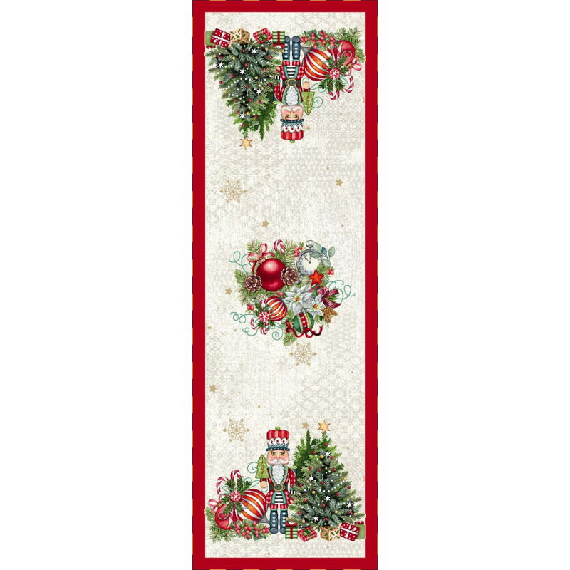 Diótörős és karácsonyfás, ezüst lurexes gépi gobelin asztali futó, 44 x 140 cm. Diótörővel, fenyőfával, ajándékokkal dekorált karácsonyi asztali futó. Anyaga vastag gépi gobelin, arany lurexes csillogása teszi igazán ünnepi hangulatúvá. Prémium minőségű termék, amely pompásan mutat az ünnepi asztalon. Megfelelő kezelés mellett hosszú évekig megőrzi szépségét és minőségét.