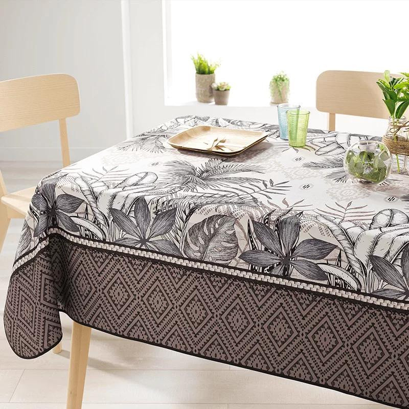 Vízlepergető dekoratív textil asztalterítő, barna dzsungel mintás, amelyről a legtöbb folyadék könnyen letörölhető. 148 x 240 cm méretben. Víz, üdítő, kávé vagy tea ömlött ki az asztalra? Töröljük le egyszerűen egy szivaccsal és a terítő vízlepergető anyagának köszönhetően nyoma sincs a foltoknak.