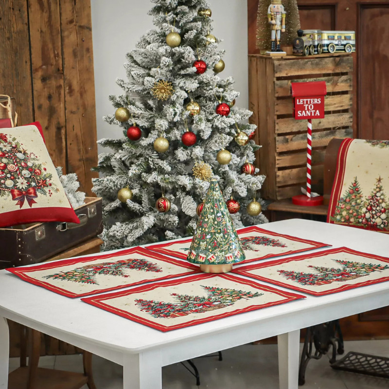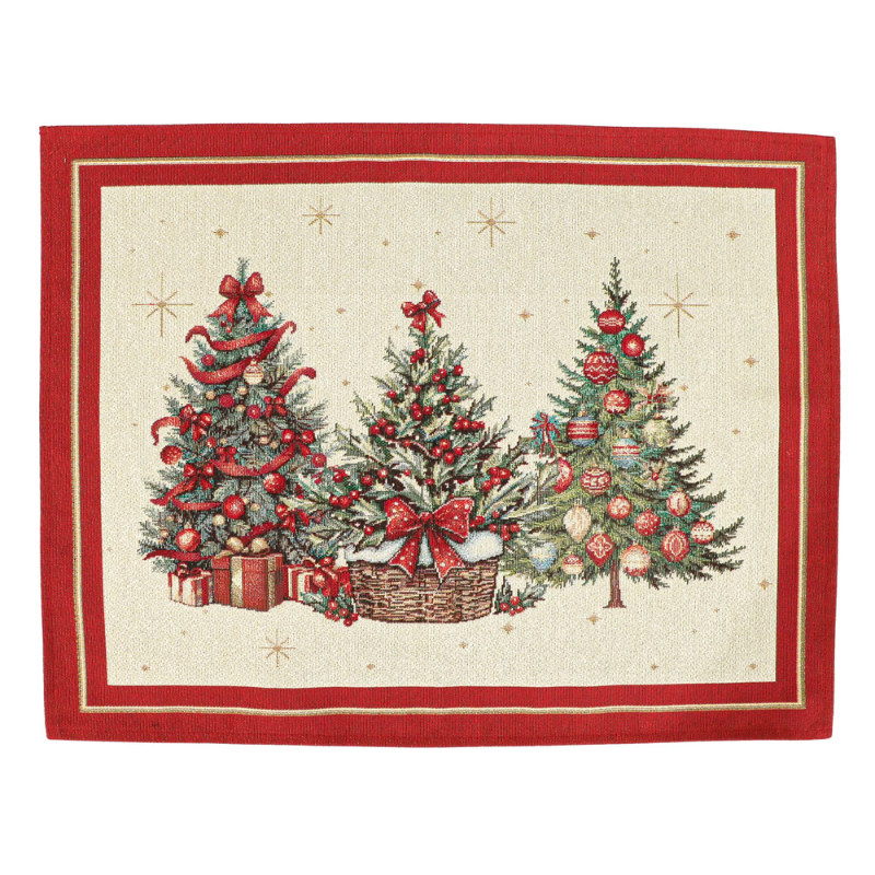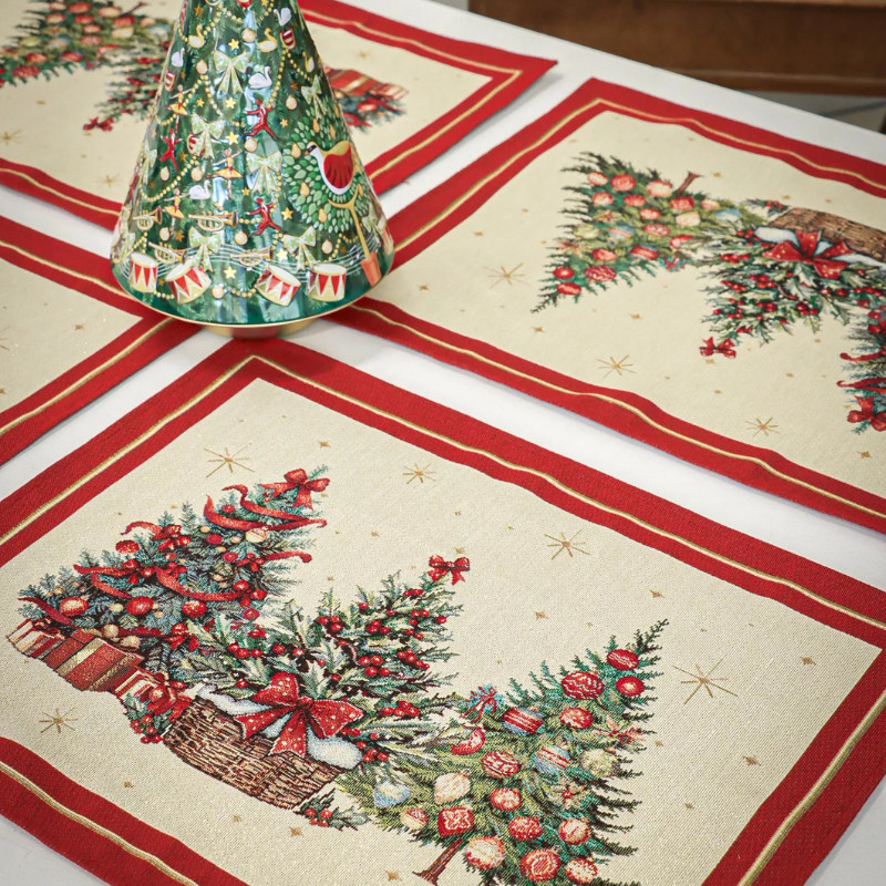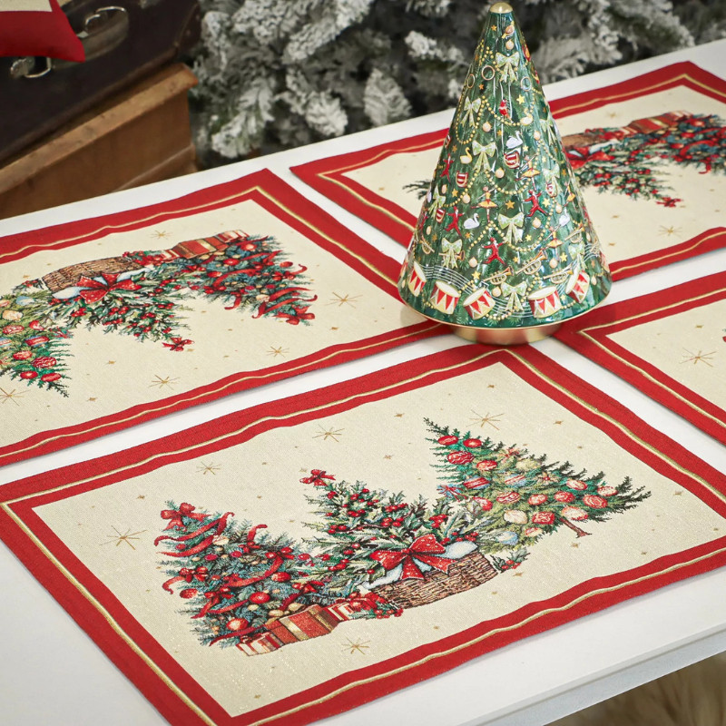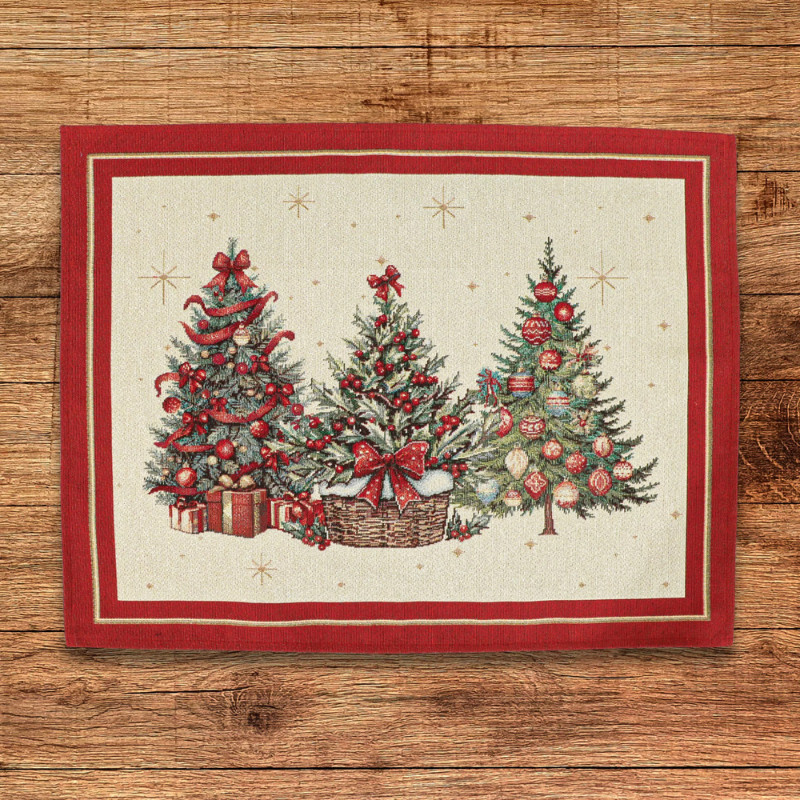 Varázsold ünnepivé az asztalterítést ezzel a karácsonyfás tányéralátéttel, amelyet fényesen csillogó arany lurex szálak tesznek igazán különlegessé! A gazdagon díszített karácsonyfák, aranyló gömbök, csillagok és hópelyhek ünnepi hangulatot varázsolnak az otthonodba. A prémium minőségű, gépi szövésű spanyol gobelin nemcsak elegáns, de rendkívül tartós is, így tökéletes választás mindennapi használatra és ünnepi alkalmakra egyaránt. Lepd meg magad vagy szeretteidet ezzel a stílusos és praktikus kiegészítővel, és tedd felejthetetlenné a karácsonyi asztalt!