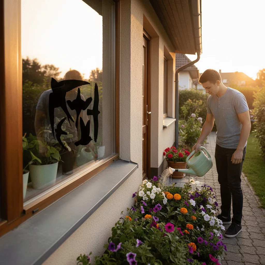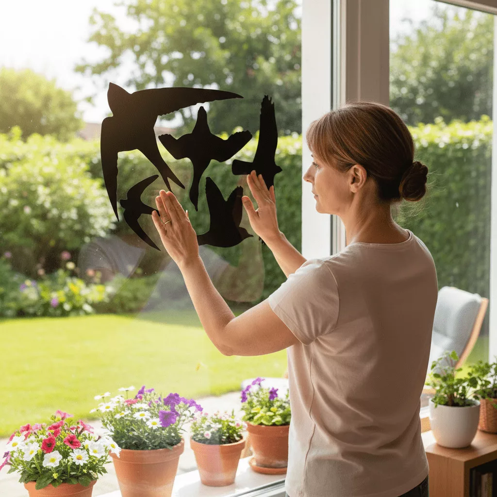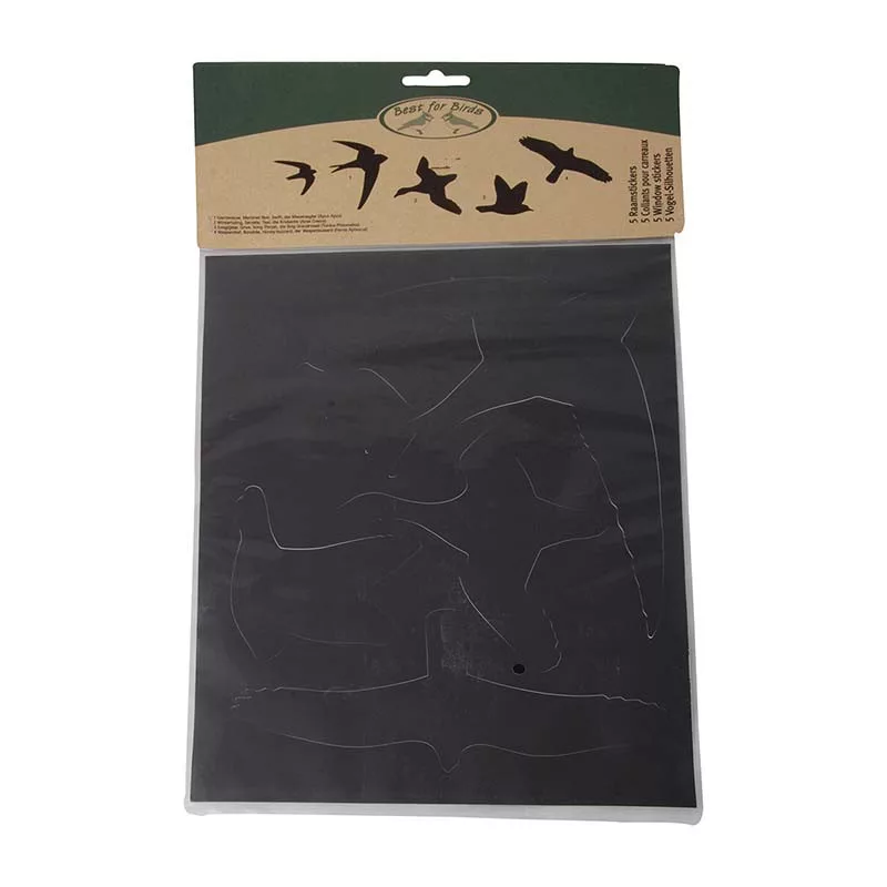 Ablakra ragasztható matrica. Az átlátszó ablakfelület láthatóvá válik, így megóvja a madarakat attól, hogy az ablaknak repüljenek. A termék mind az 5 féle madár sziluettből tartalmaz egy darabot. Különösen nagyobb felületű üvegeknél praktikus, de önmagában is mutatós dekorációként szolgál bármely felületen.