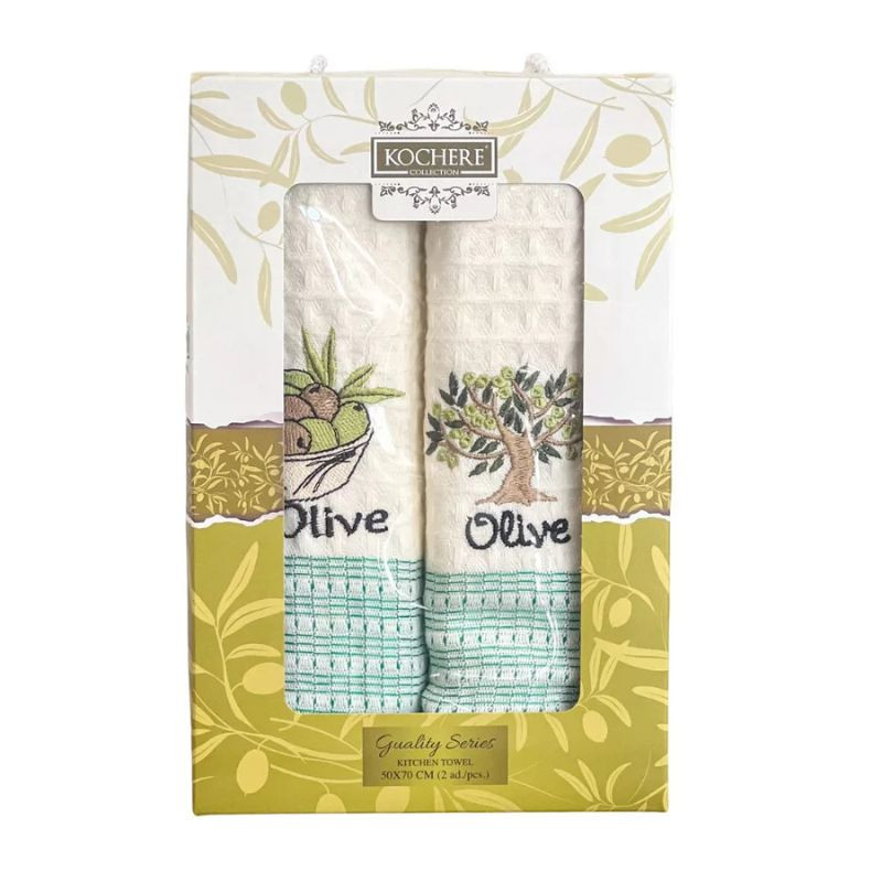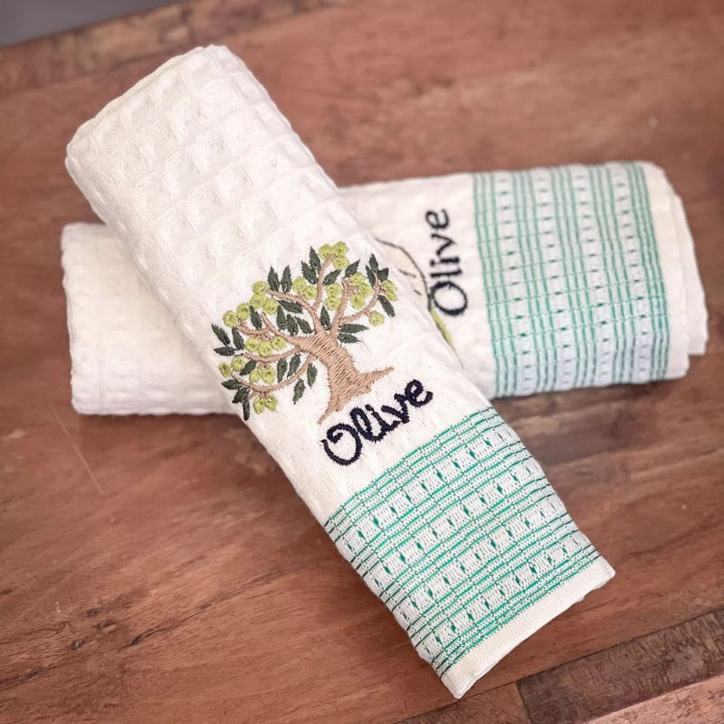 Díszdobozba csomagolt konyharuha szett oliva mintával. A szett 2 darab egyforma méretű pamut konyharuhát tartalmaz, hímzett olivás mintával. Gyönyörű csomagolása miatt kiváló választás lehet ajándékba egy üveg bor vagy egy tábla csokoládé mellé is.