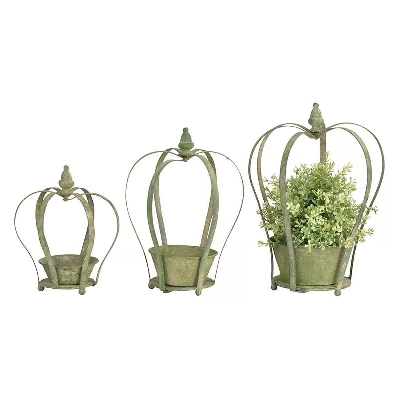 Antik hatású, korona formájú virágtartó, zöldes-barnás színben. Tegyük bele kedvenc virágainkat vagy fűszernövényeinket és tegyük stílusossá otthonunkat. A francia kertek meseszerű hangulatát idézi, elsősorban különleges antikolt felületének köszönhetően. Egyedi patinája teszi különlegessé, amivel elhozza a természetességet, a nyugalmat és az autentikus hangulatot kertünkbe. A tartó egyik szára elfordítható, így a kaspó könnyen kivehető.